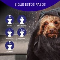 Sus componentes nos ayudarán a eliminar las tonalidades amarillentas y/o «oxidadas» del pelaje a la hora del baño. En perros de color negro, esa tonalidad se verá intensificada.