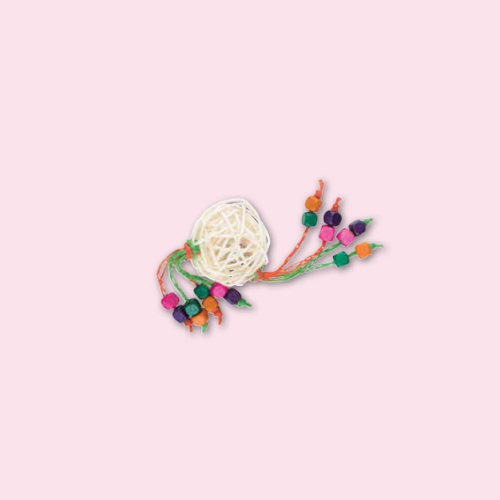 Bolita de Ratán con cuentas de madera natural de colores. Este juguete les llamará mucho la atención. Las cuerdas son de doble hilo, resistente, colorido y llamativo.