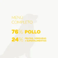 Carne, huesos carnosos y vísceras frescas de pollo 76%, boniato fresco 9%, calabaza fresca 9%, zanahoria fresca 2%, manzana fresca 2%, arándanos frescos <1%, Fórmula SUPERFood Complete 8000mg/kg (minerales naturales (aportan oligoelementos esenciales), raíz de Achicoria (Cichorium intybus, fuente natural de inulina), levadura de cerveza (Saccharomyces cerevisiae, fuente de MOS), cúrcuma longa (fuente natural de antioxidantes), alga kelp (Ascophyllum nodosum, aporte natural de minerales y yodo), espirulina (Arthrospira platensis, fuente natural de carotenoides), mejillón de labio verde (Perna canaliculus, aporte natural de glucosamina y condroitina), Bacillus coagulans (probiótico que favorece la microbiota intestinal)), glicerina de origen vegetal (ayuda a mantener la humedad), Antioxidantes naturales