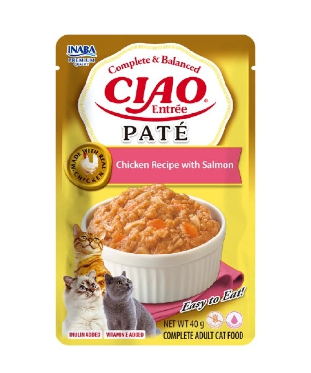 Una receta húmeda en formato paté, con textura muy suave y fácil de deshacer. Elaborada con pollo y salmón, pensada como alimento completo con un enfoque claro: que el gato coma sin esfuerzo y con buena aceptación 🐟🍗
