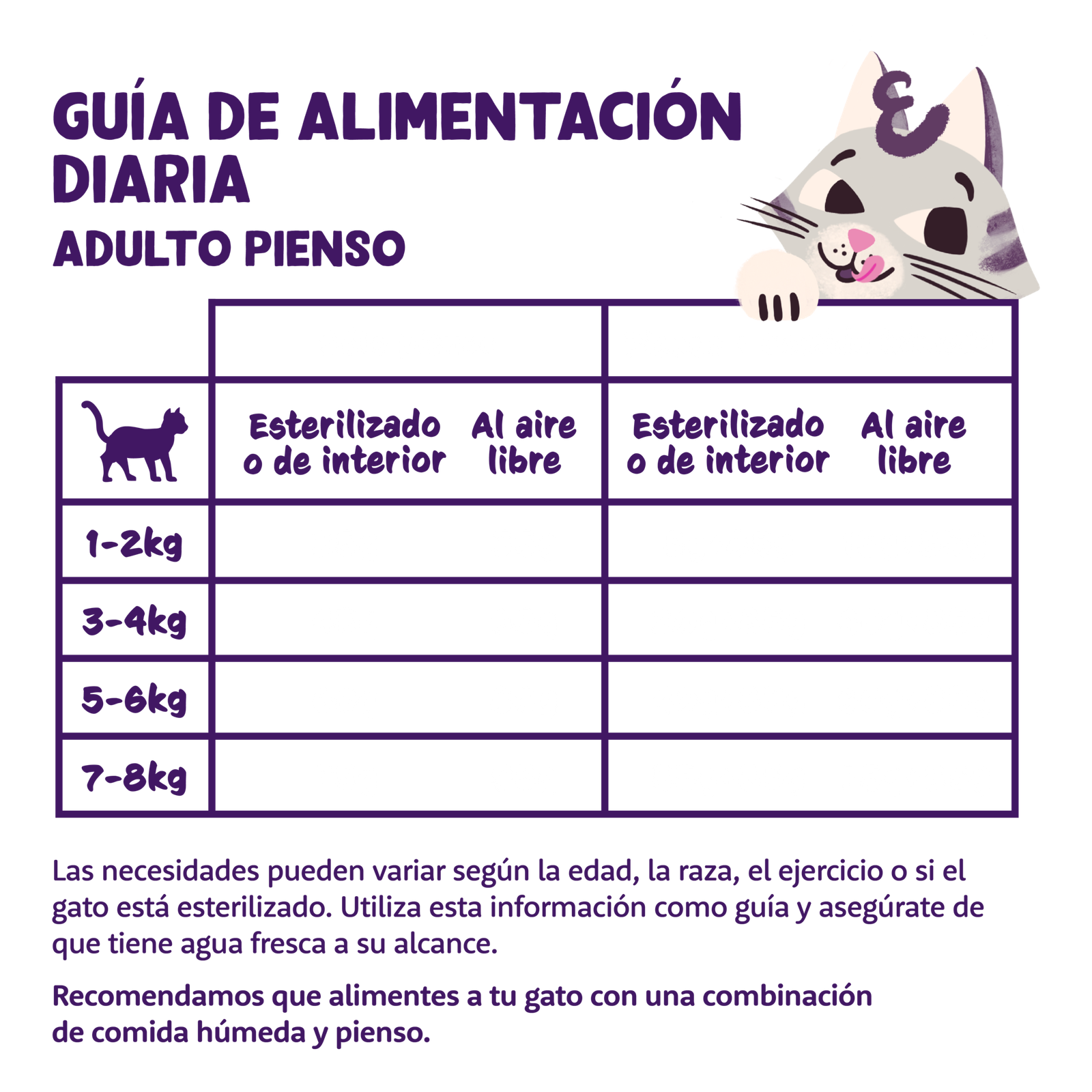 Servir seco siguiendo la ración diaria recomendada según el peso y nivel de actividad del gato.