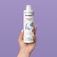 Champú sin sulfatos para perros y gatos adultos de pelo blanco. Contiene ingredientes activos naturales como Aloe Vera y Extracto de Aciano que ayuda a eliminar los tonos amarillentos del pelaje al mismo tiempo que hidrata y protege la piel.