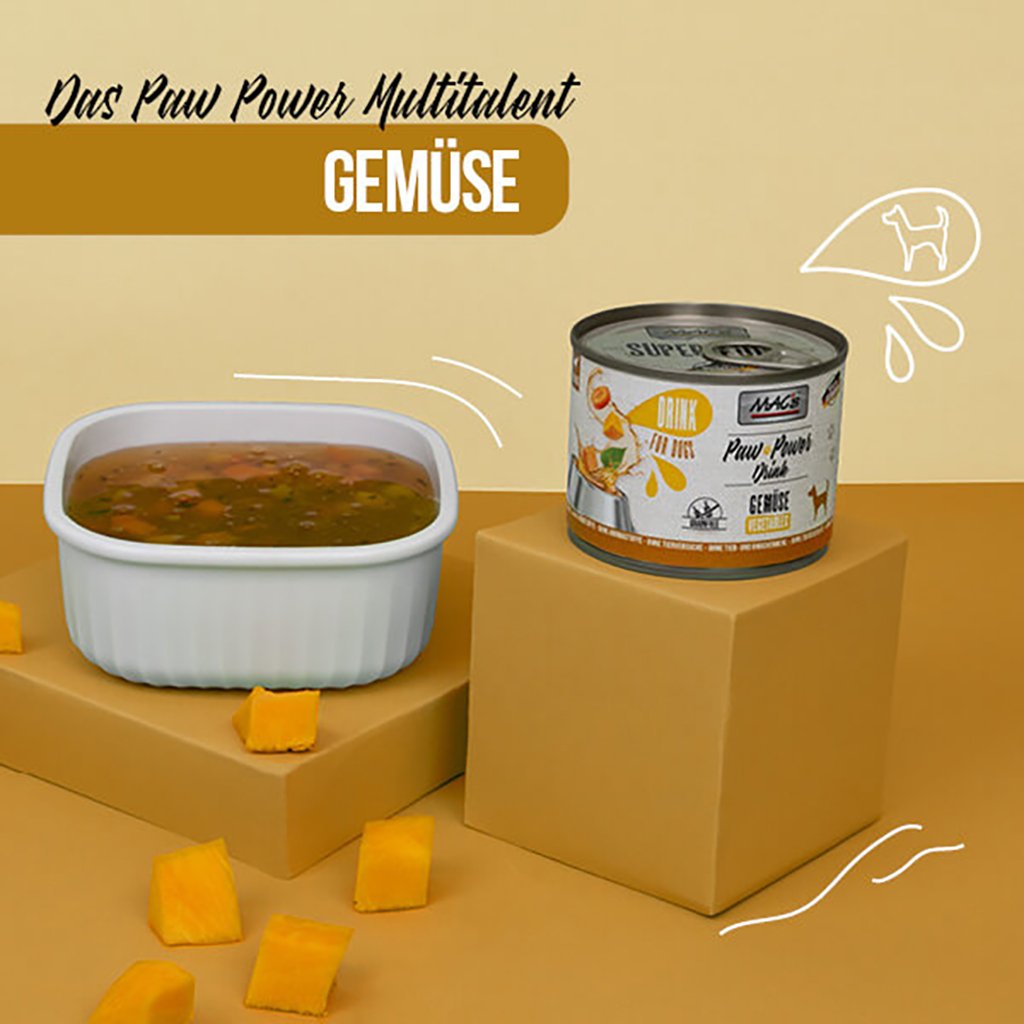 MAC’s Dog Paw Power Drink Gemüse 200g es un complemento alimenticio líquido para perros, elaborado únicamente con ingredientes vegetales 🌱. Su fórmula contiene caldo de verduras, batatas, calabaza, zanahorias y hojas de ortiga, sin proteínas animales, lo que lo hace hipoalergénico 🛡️ y adecuado para perros con sensibilidades alimentarias o alergias a la proteína animal.